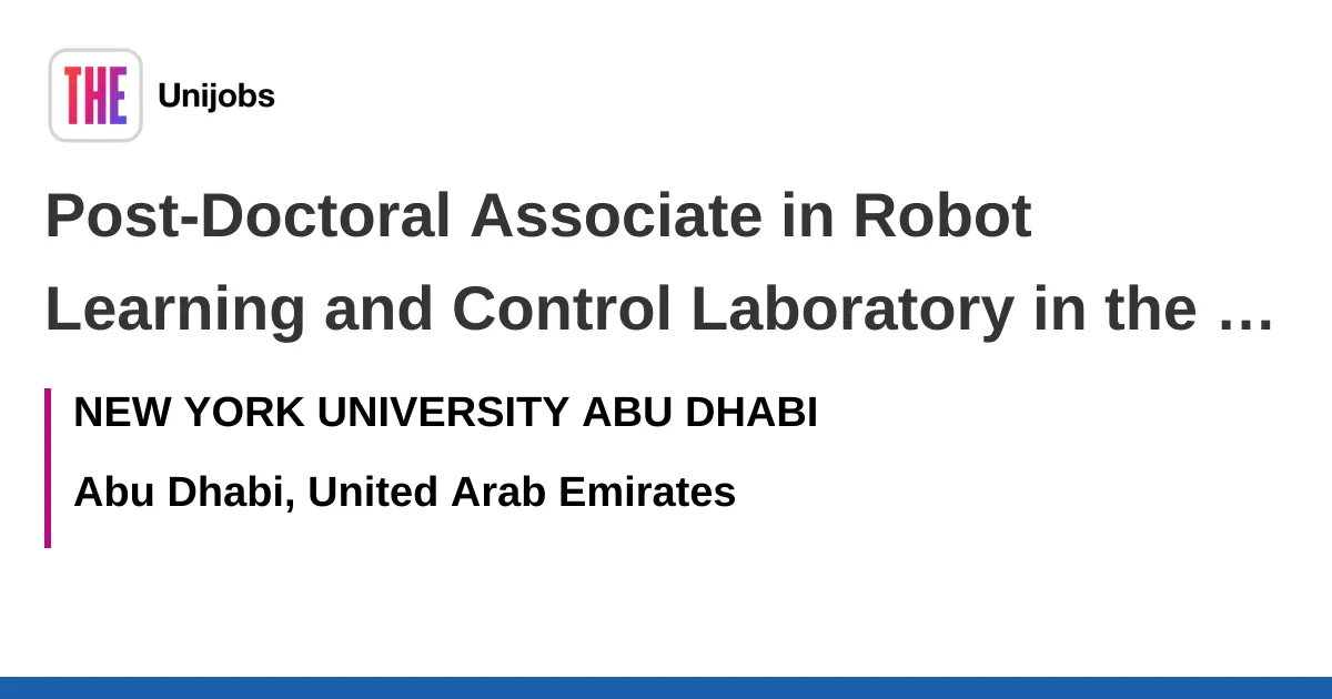 The Robot Learning & Control Lab (REAL Lab) at New York University Abu Dhabi is recruiting a Post-Doctoral Associate to advance research in robot intelligence, machine learning, and AI-driven manipulation. The successful candidate will join a world-class research institution and contribute to projects at the intersection of robot learning, control, and AI for physical systems. Research topics include developing algorithms for robot autonomy, dexterous manipulation, semantic navigation and mapping, and safe, certified control for human-robot collaboration. The lab focuses on real-world robotic systems, including mobile manipulators and tasks involving complex object handling and uncertain environments. Applicants should hold a PhD in Robotics, Control Engineering, Machine Learning, AI, Mechanical or Electrical Engineering, or a closely related field. Desired qualifications include expertise in robot manipulation learning and control, differential geometry, safe control methods (Lyapunov stability, barrier functions), and hands-on experience with robotic manipulators (preferably Franka Emika R3 robots). Candidates should have a strong publication record in top-tier venues and proficiency in Python, C++, ROS, and machine learning frameworks such as PyTorch or TensorFlow. The position offers very competitive employment terms, including housing and educational subsidies for children, with an initial 2-year contract and the possibility of renewal. NYU Abu Dhabi provides a collaborative, interdisciplinary research environment and is part of NYU’s global network. Applications are accepted immediately and considered until the position is filled. For questions, contact Prof. Fares Abu-Dakka. To apply, submit a cover letter, CV with publication list, research statement, transcript, and two reference letters.